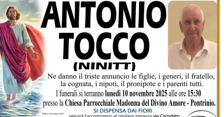 Presso l'ospedale di Sora si è spento oggi Antonio Tocco. Era molto conosciuto e tutti lo chiamavano Ninitt. I funerali saranno officiati domani pomeriggio, alle ore 15.30, presso la chiesa del Divino Amore nel quartiere Pontrinio. Ai familiari le condoglianze dalla redazione del nostro sito.
