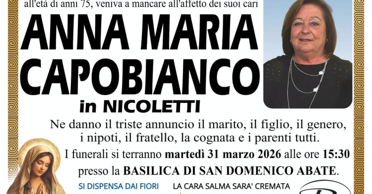 Presso l’ospedale Ss Trinità di Sora si è spenta ieri la signora Anna Maria Capobianco in Nicoletti. Aveva 75 anni. I funerali saranno officiati domani, martedì 31 marzo, alle ore 15.30, presso la Basilica di San Domenico Abate. Ai familiari le condoglianze dalla redazione del nostro sito.