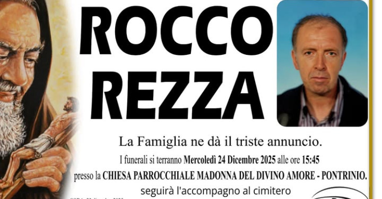 Nella sua abitazione di via Pontrinio, all’età di 69 anni, si è spento oggi Rocco Rezza. La triste notizia ha suscitato profondo cordoglio a Sora, dove era conosciuto e stimato. I funerali saranno officiati domani. mercoledì 24 dicembre 2025 alle ore 15,45 presso la Chiesa Parrocchiale Madonna…