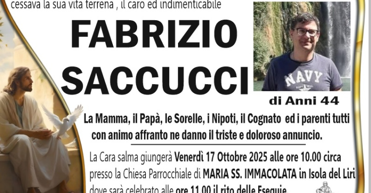 Sono stati fissati i funerali del 44enne di Isola Liri, Fabrizio Saccucci stroncato l'altra sera da un malore. La funzione si terrà domani mattina, venerdì 17 ottobre, presso la Parriocchia di Santa Maria Immacolata nella frazione Selva. Ai familiari rinnoviamo le condoglianze dalla redazione del…