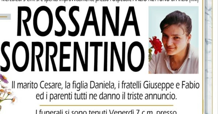 Grande commozione ad Anzio dove viveva e a Isola Liri di dove era originaria, per la morte di Rossana Sorrentino. La donna si è spenta qualche giorno fa e i funerali sono stati già celebrati. A tutti i familiari le condoglianze dalla redazione del nostro sito.