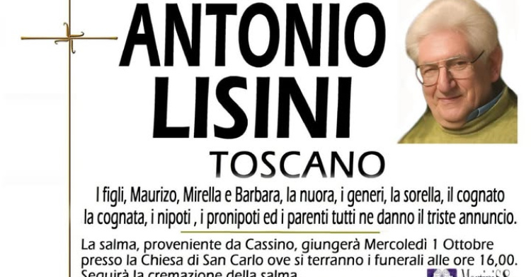 Questa mattina a Cassino si è spento Antonio Lisini. "Toscano" aveva 82 anni, era molto conosciuto e stimato. I funerali saranno officiati domani pomeriggio, alle ore 16, presso la Parrocchia di San Carlo a Isola Liri Superiore. Ai famliari le condoglianze dalla redazione del nostro sito.