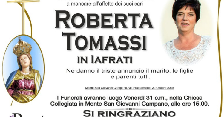 Grande commozione per la morte della signora Roberta Tomassi in Iafrati. La donna, aveva 59 anni, era molto conosciuta e stimata a Monte San Giovanni Campano e a Isola Liri, si è spenta stamane nella sua abitazione. I funerali saranno officiati domani pomeriggio, alle ore 15, presso la Collegiata…