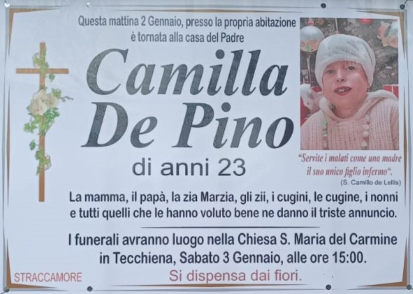 Grande commozione a Tecchiena di Alatri per la scomparsa della 23 enne Camilla Di Pino. La ragazza si è spenta nella sua abitazione. I funerali saranno officiati domani, 3 novembre, alle ore 15, presso la chiesa di Santa Maria del Carmine. A tutti i familiari le condoglianze dalla redazione del nostro sito.