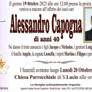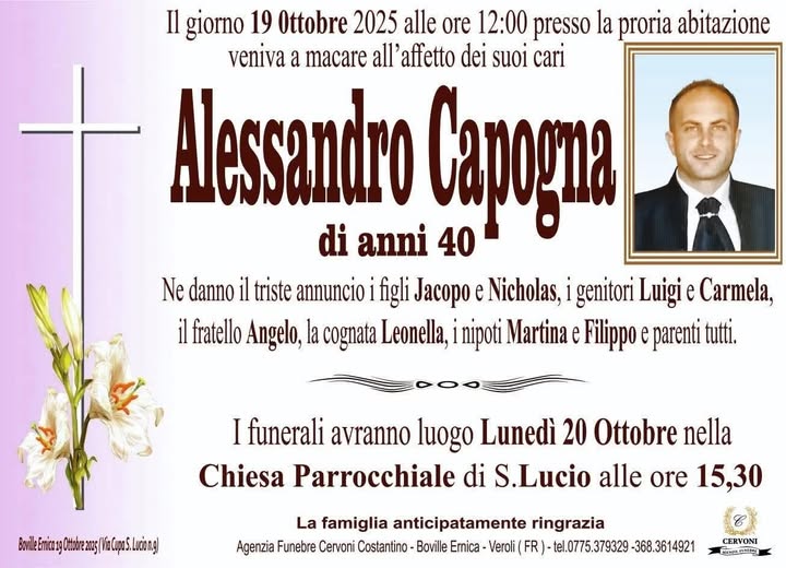 Grande commozione a Boville Ernica per la morte del 40enne Alessandro Capogna. L’uomo si è spento questa mattina presso la sua abitazione. I funerali saranno officiati domani, 20 ottobre, alle ore 15.30, presso la chiesa parrocchiale della frazione San Lucio. Ai familiari le condoglianze dalla redazione del nostro sito.