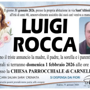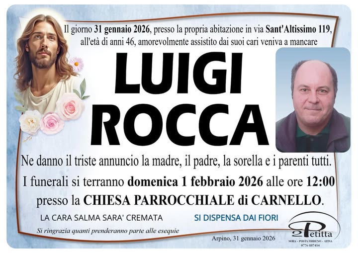 Grande commozione ad Arpinno per la prematura scomparsa di Luigi Rocca spentosi nella sua abitazione di località Sant’Altissimo. Aveva 46 anni. I funerali saranno officiati domani – domenica 1 febbraio – alle ore 12, nella chiesa parrocchiale di Carnello. A tutti i familiari le condoglianze della redazione del nostro sito.
