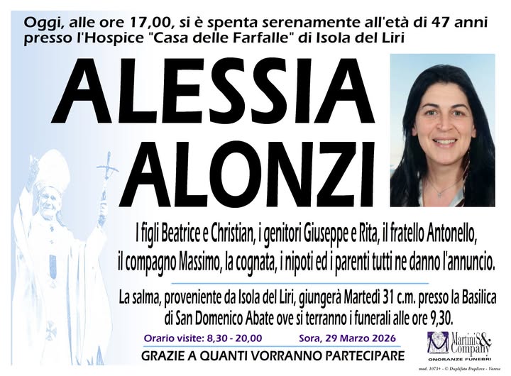 Grande commozione a Sora per la prematura scomparsa di Alessia Alonzi, avvenuta oggi pomeriggio presso la Casa delle farfalle di Isola Liri. Aveva 47 anni. I funerali saranno officiati martedì, 31 marzo, alle ore 9.30, presso la Basilica di San Domenico. Ai familiari le condoglianze dalla redazione del nostro sito.