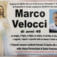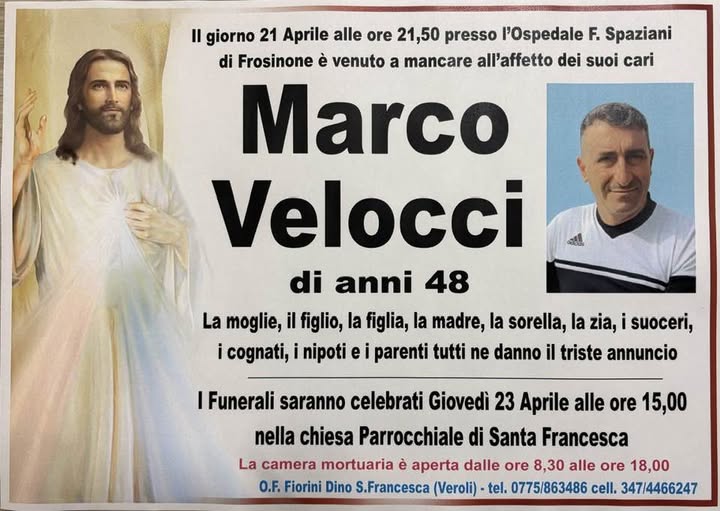 Grande commozione a Veroli ed in particolare nella frazione Santa Francesca per la prematura morte di Marco Velocci. L'uomo si è spento ieri a 48 anni presso l'ospedale di Frosinone. I funerali saranno officiati domani, 23 Aprile, alle ore 15, presso la chiesa parrocchiale di Santa Francesca. Ai familiari le condoglianze dalla redazione del nostro sito.