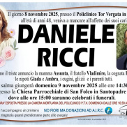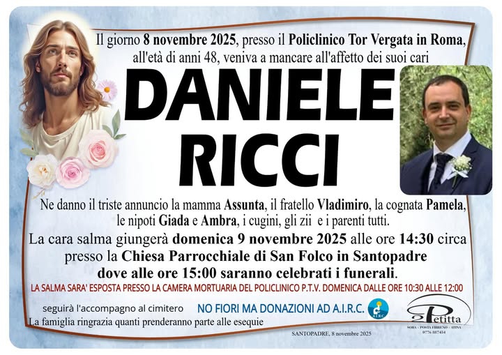 Grande commozione per la morte del 48enne Daniele Ricci. Si è spento poche ore fa al Policlinico di Tor Vergata, a Roma. Viveva a Frosinone ed era dipendente della Asl, ma la sua famiglia è originaria di Santopadre