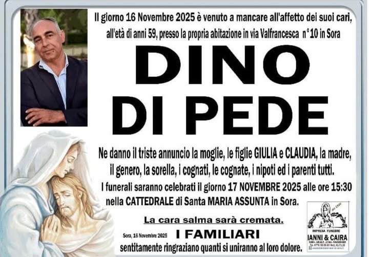 Grande commozione a Sora per la morte di Dino Di Pede spentosi oggi nella sua abitazione di località Valfrancesca. I funerali saranno officiati alle 15.30 di domani – lunedì 17 novembre – nella cattedrale Santa Maria Assunta di Sora.
