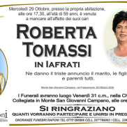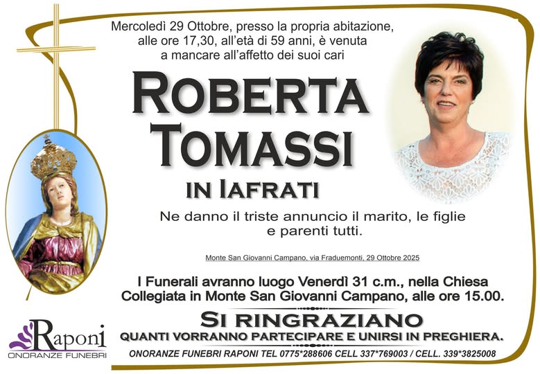 Grande commozione per la morte della signora Roberta Tomassi in Iafrati. La donna, aveva 59 anni, era molto conosciuta e stimata a Monte San Giovanni Campano e a Isola Liri, si è spenta stamane nella sua abitazione. I funerali saranno officiati domani pomeriggio, alle ore 15, presso la Collegiata di Monte San Giovanni Campano. Ai familiari le condoglianze dalla redazione del nostro sito.