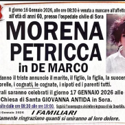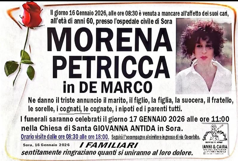 Nella mattinata di oggi presso l’Ospedale Civile di Sora, all’età di 60 anni, si è spenta Morena Petricca in De Marco. La triste notizia ha destato grande commozione. I funerali saranno celebrati domani, 17 gennaio 2026, alle ore 11, presso la Chiesa di Santa Giovanna Antida di Sora. A tutti i familiari le ondoglianze dalla redazione del nostro sito.