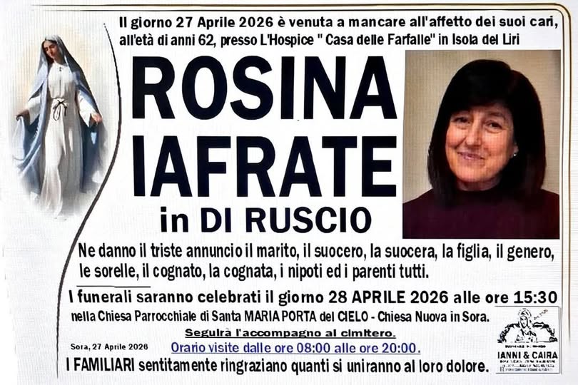 I funerali saranno celebrati domani, martedì 28 aprile 2026, alle ore 15.30, presso la Chiesa Parrocchiale di Santa Maria Porta del Cielo a Sora.