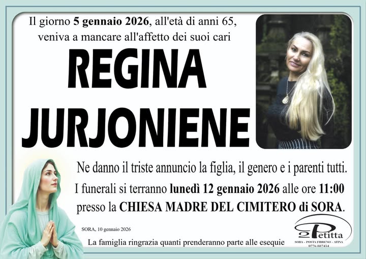 La 65enne Regina Jurjoniene, originaria della Lituania, si è spenta lo scorso 5 gennaio in seguito ad un malore. La Procura ha disposto l'autoposia e ora è stato concesso il nulla osta per i funerali. Saranno officiati domani, lunedì 12 gennaio, alle ore, 11 nella Chiesa del Cimitero. Ai familiari le condoglianze della redazione del nostro sito.