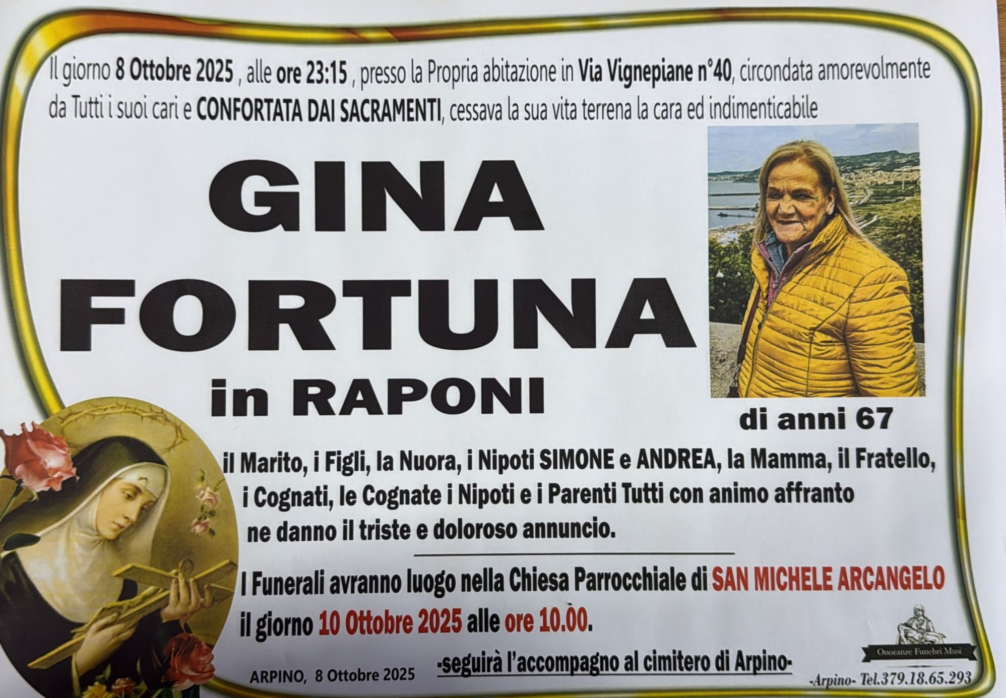 Questa notte nella sua abitazione di contrada Vignepiane ad Arpino, si è spenta Gina Fortuna – Raponi. Aveva 67 anni. I funerali saranno officiati, alle 10 di domani, venerdì 10 ottobre, in San Michele Arcangelo.
