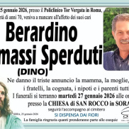 Commozione a Sora per la morte di Bernardino Tomassi Sperduti, per tutti Dino. L'uomo si è spento ieri a Roma, presso il Policlinico di Tor Vergata. Agente di commercio in pensione, Dino era conosciuto e stimato. I funerali saranno officiati domani mattina, 27 gennaio, alle ore 11.30, presso la chiesa di San Rocco. A tutti i familiari le condoglianze dalla redazione del nostro sito.