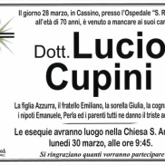 Grande commozione per la morte del dottor Lucio Cupini. Aveva 70 anni ed era ricoverato presso il San Raffaele a Cassino. I funerali saranno officiati domani, lunedì 30 marzo, alle ore 9.45, presso la chiesa di San Antonio a Frosinone.