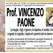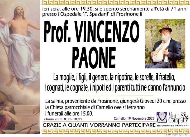 Presso l'ospedale Spaziani di Frosione si è spento ieri sera il professor Vincenzo Paone. Aveva 71 anni ed era molto noto. I funerali saranno officiati domani, giovedì 20 Novembre, alle ore 15, nella chiesa parrocchiale di Carnello. Ai familiari le condoglianze dalla redazione del nostro sito.