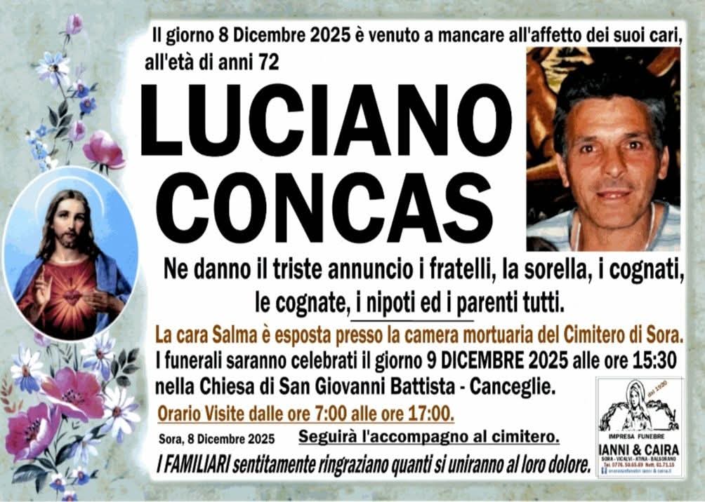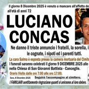 Saranno officiati alle 15.30 di oggi – martedì 9 dicembre – nella chiesa San Giovanni Battista, nel Rione Canceglie, i funerali di Luciano Concas.