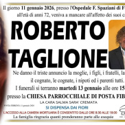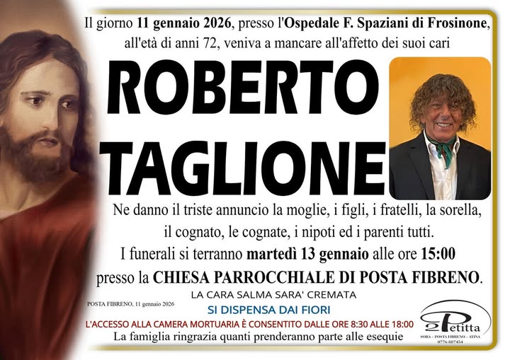 Grande commozione a Posta Fibreno per la morte di Roberto Taglione spentosi ieri presso l'ospedale Spaziani di Frosinone. Era molto conosciuto e stimato per il suo costante impegno a favore del lago. Aveva 72 anni. I funerali saranno officiati alle 15 di domani martedì 13 gennaio nella chiesa parrocchiale di Posta Fibreno. Ai familiari le condoglianze dalla redazione del nostro sito.