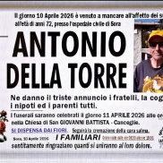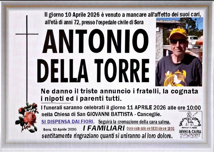 Grande commozione a Sora ed in particolare nel rione Canceglie per la prematura morte di Antonio Della Torre. Una vita dedicata agli amici e alla musica. Aveva 72 anni.