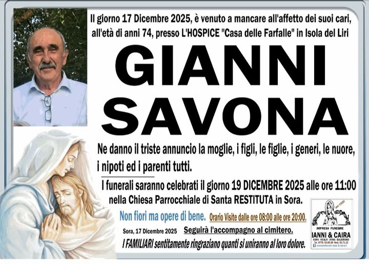 Ieri presso la Casa delle Farfalle dell’Hospice di Isola del Liri si è spento Gianni Savona. Aveva 74 anni. Da tempo in pensione, nell’ultimo periodo aveva lavorato in Municipio. Collaborava con la parrocchia di Santa Restituta svolgendo la preziosa funzione del sacrestano.