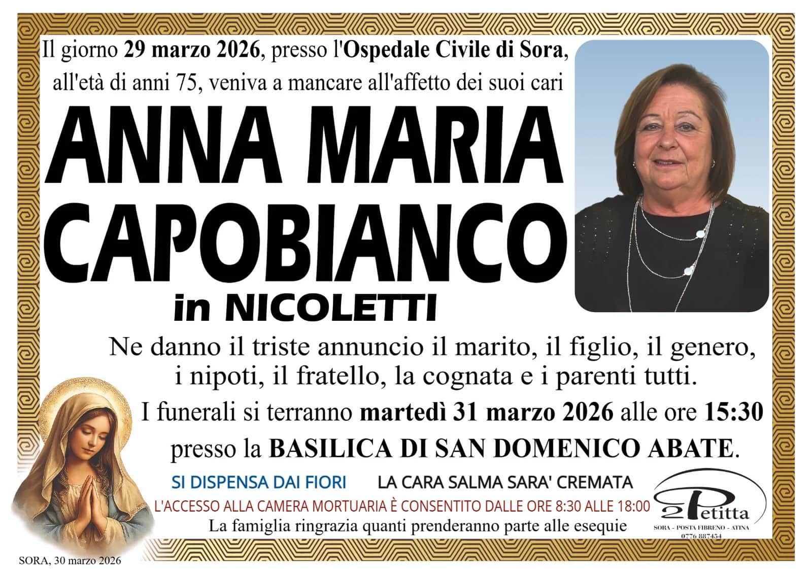 Presso l’ospedale Ss Trinità di Sora si è spenta ieri la signora Anna Maria Capobianco in Nicoletti.