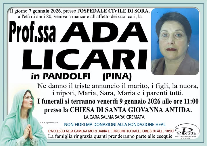 Si è spenta ieri presso il Santissima Trinità di Sora la professoressa Ada Licari – Pandolfi.