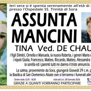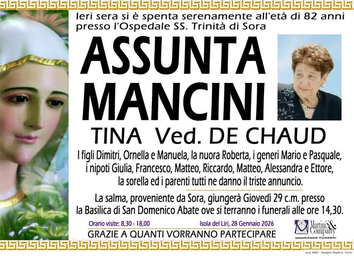Nella serata di ieri presso l’ospedale Ss Trinità di Sora si è spenta Assunta Mancini, vedova De Chaud. Per tutti era Tina e aveva 82 anni. I funerali saranno officiati domani, Giovedì 29 gennaio, alle ore 14.30, presso la Basilica di San Domenico a Sora. A tutti i familiari le condoglianze dalla redazione del nostro sito.