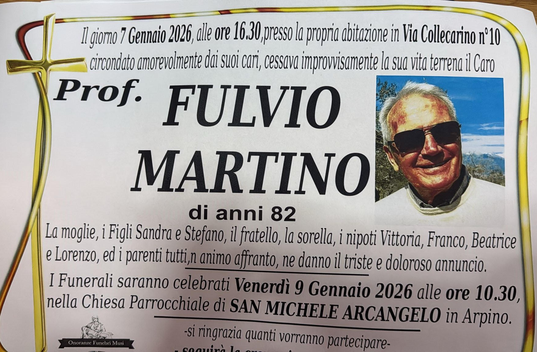 Un malore improvviso ha stroncato il professor Fulvio Martino. Aveva 82 anni e viveva nella frazione di Collecarino.