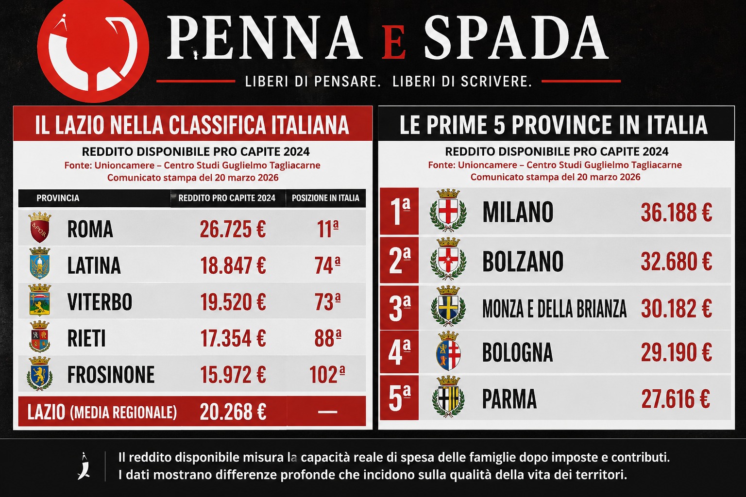 Il 20 marzo 2026 Unioncamere insieme al Centro Studi Guglielmo Tagliacarne ha pubblicato un’analisi sul reddito disponibile delle famiglie. Tradotto: quanti soldi restano davvero in tasca alle persone. Non il PIL, non l’export, non i grandi numeri. La vita reale.