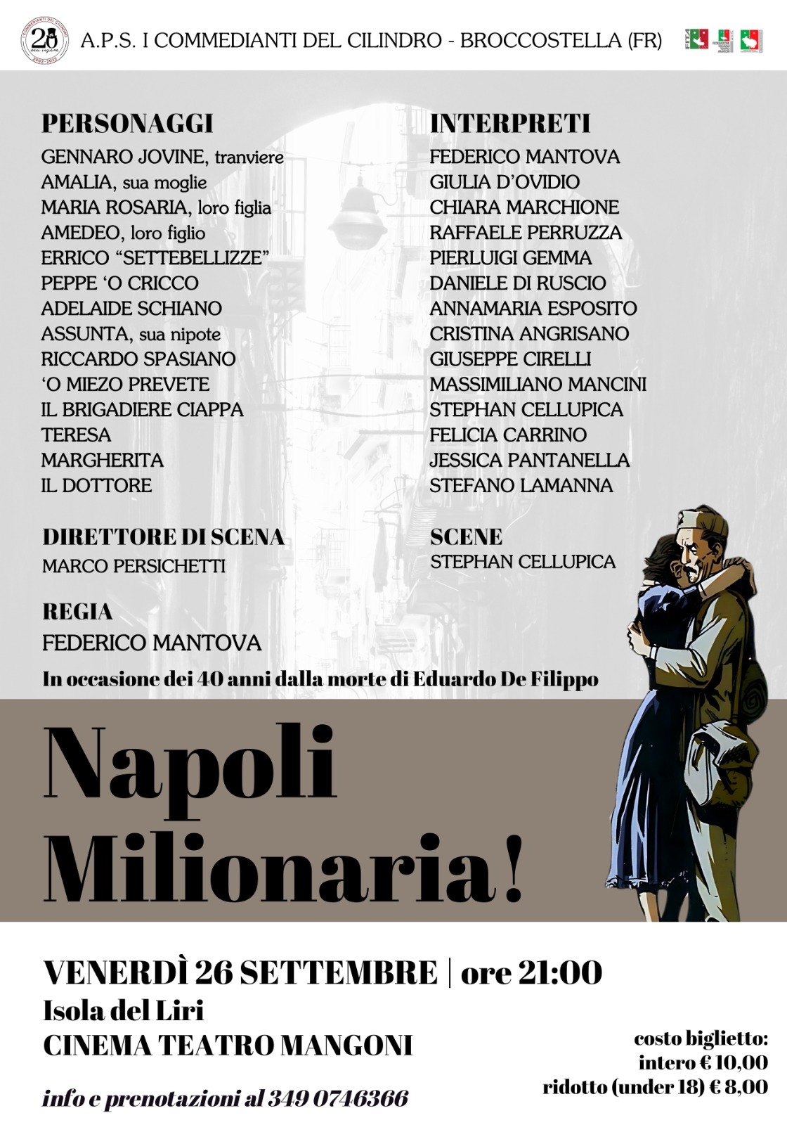 Dopo 8 anni, torna ad Isola del Liri il Teatro d'Autore. Venerdì prossimo 26 Settembre, alle ore 21,00, verrà messa in scena al Cinemateatro Mangoni la famosa Commedia di Eduardo De Filippo "Napoli Milionaria".