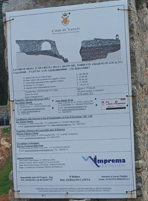 Sono ripresi e stanno proseguendo velocemente i lavori di messa in sicurezza degli argini del torrente Amaseno nella località Casamari di Veroli. E c’è anche il cartello con tutte le indicazioni tecniche ed economiche. La ditta appaltatrice dei lavori sta rimediando ai danni fatti dal maltempo negli ultimi mesi.