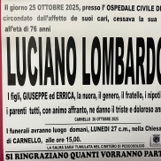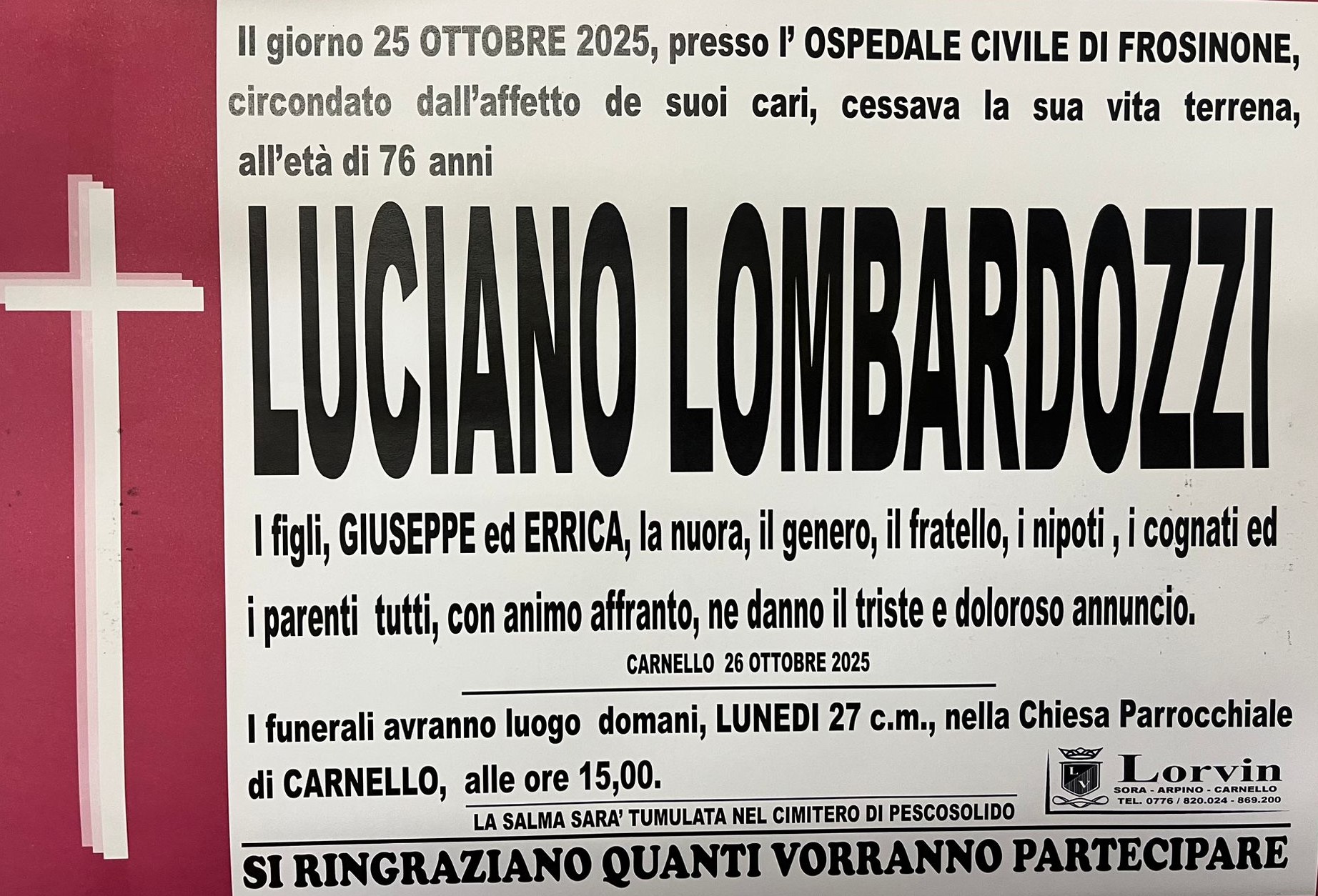 Il mondo imprenditoriale e sportivo di Sora piange Luciano Lombardozzi. I funareli saranno officiati alle 15 di domani – lunedì 27 ottobre – nella chiesa parrocchiale di Carnello. Si è spento ieri all’età di 76 anni presso lo Spaziani di Frosinone. Fu costruttore e presidente del Sora Calcio verso la metà degli anni ’80. Della sua gestione si ricordano, allo stadio Panico - Trecce due prestigiose gare amichevoli del bianconeri con il Napoli e l'Ascoli.