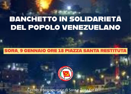 Il Circolo Intercomunale “Antonio Gramsci” di Sora e Zona Est FR di Rifondazione Comunista, Condanna fermamente l’attacco militare del governo Trump contro la Repubblica del Venezuela e il rapimento del suo presidente, Nicolas Maduro, e di sua moglie. Un atto di guerra in palese violazione del diritto internazionale e della Carta delle Nazioni Unite per la quale non esistono giustificazioni.