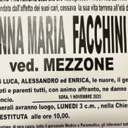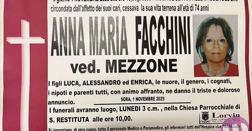 Anna Maria Facchini – Mezzone si è spenta ieri presso l’Hospice di Isola del Liri all’età di 74 anni. Cordoglio in città. I funerali saranno officiati alle 10 di domani – lunedì 3 novembre – nella chiesa Santa Restituta di Sora. A tutti i familiari le condoglianze dalla redazione del nostro sito.