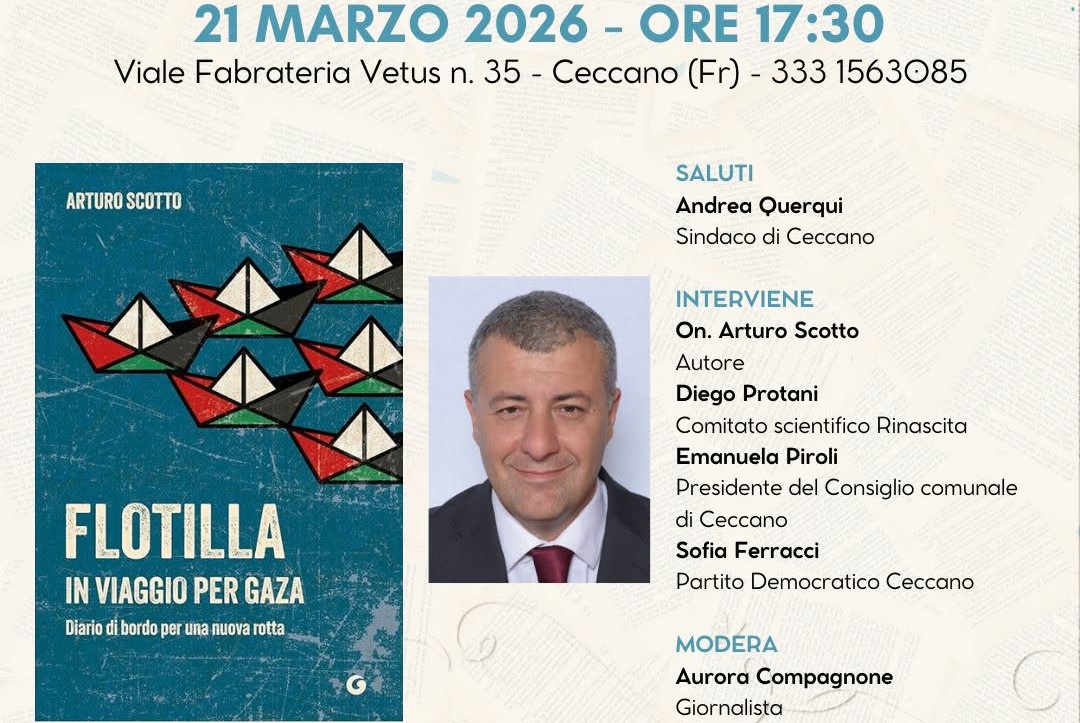 Domani, sabato 21 marzo alle ore 17.30 a Ceccano si svolgerà presso il caffè letterario Sinestesia la presentazione del libro di Arturo Scotto "Flotilla in viaggio per Gaza" edito da Giunti. Un libro che parla a chi chiede giustizia, diritti e pace, fuori dai linguaggi tradizionali della politica.