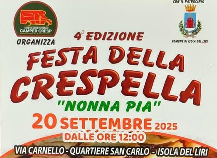 Quarta edizione della Festa della crespella – Nonna Pia, domani 20 Settembre, dalle ore 12, lungo via Carnello, nel quartiere San Carlo di Isola Liri superiore. Il protagonista sarà Re Carlo con il suo Camper Cresp.