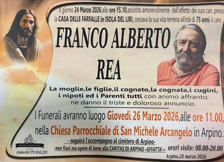 Commozione ad Arpino per la morte di Franco Alberto Rea spentosi ieri presso la Casa delle Farfalle di Isola Liri. Era molto conosciuto per aver lavorato al Convitto Tulliano.