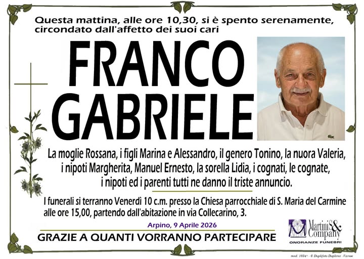 ARPINO - SI E' SPENTO FRANCO GABRIELE