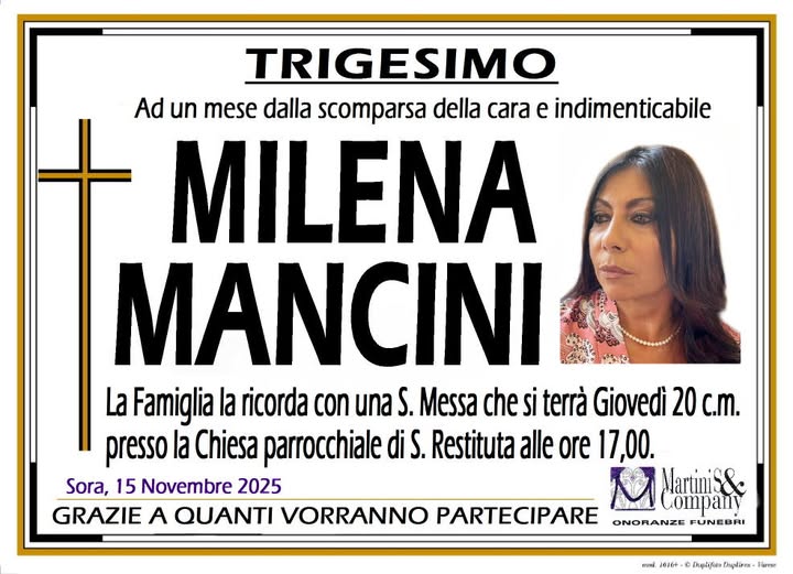 Dalla prematura morte dell'imprenditrice isolana Milena Mancini è già passato un mese. Domani pomeriggio, giovedì 20 novembre, alle ore 17, nella chiesa di Santa Restituta a Sora la famiglià da ricorderà con una messa di suffragio in occasione del trigesimo.