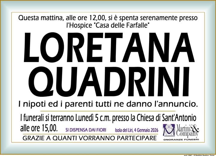 Grande commozione a Isola Liri per la morte di Loretana Quadrini. La donna, molto conosciuta e stiama, si è spenta stamane presso l'Hospice. I funerali ssranno officiati domani pomeriggio, alle ore 15, presso la chiesa di S. Antonio. Ai familiari le condoglianze dalla redazione del nostro sito.