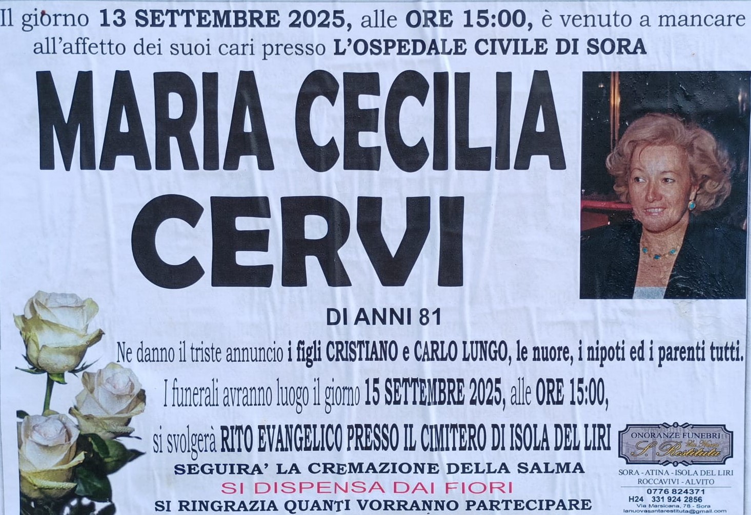 Nel pomeriggio di ieri, presso l’ospedale Ss Trinità di Sora, si è spenta la signora Maria Cecilia Cervi. La donna era molto conosciuta, a Isola Liri e non solo, per aver a lungo gestito l’autoscuola Europa nel quartiere Pirandello. I funerali si terranno domani pomeriggio in cimitero a Isola Liri con il rito evangelico. A tutti i familiari le condoglianze dalla redazione del nostro sito.