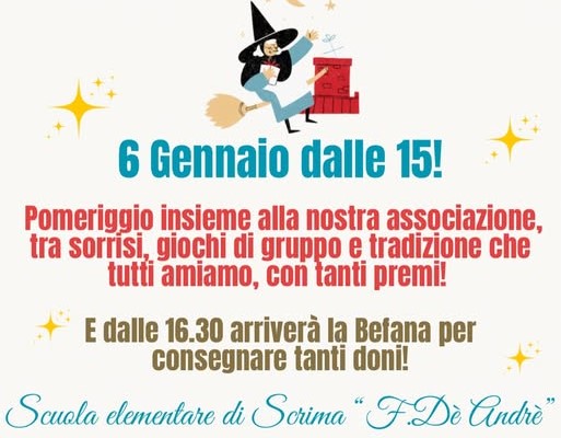 L’Associazione Tradizione Scrima invita grandi e piccoli a un pomeriggio di festa e convivialità che si terrà il 6 gennaio, a partire dalle ore 15.00, presso la Scuola Elementare Fabrizio De André di Scrima.