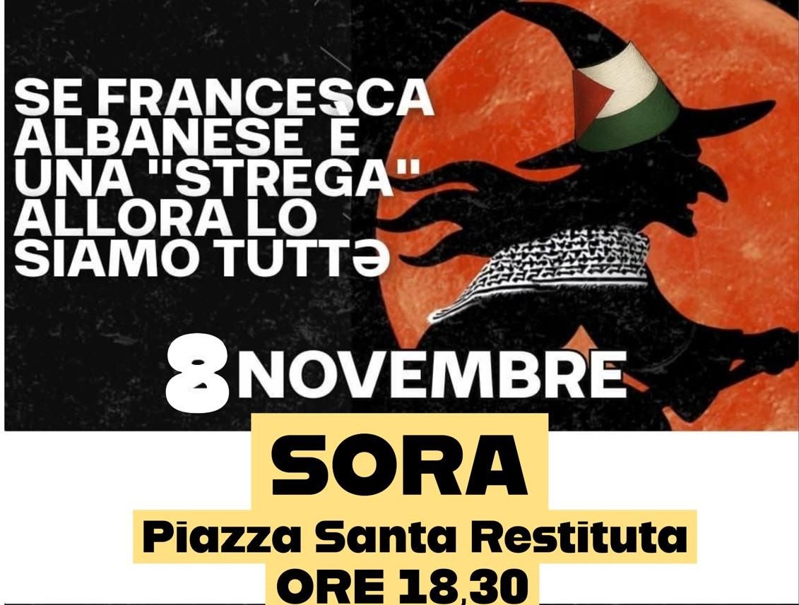 La Federazione di Frosinone del Partito della Rifondazione Comunista insieme al circolo PRC "A.Gramsci" di Sora promuovono e invitano a partecipare sabato 8 novembre alle ore 18 30 in Piazza Santa Restituta a Sora, associazioni,partiti e singoli cittadini a manifestare vicinanza e solidarietà a Francesca Albanese.