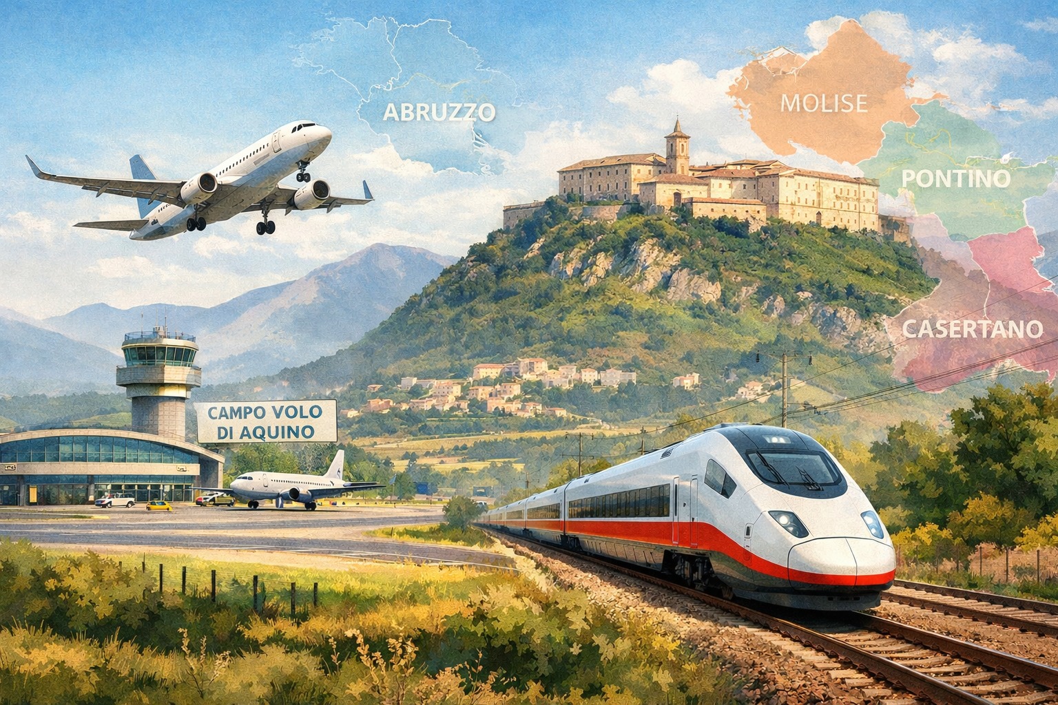 È qui che il discorso torna con i piedi per terra. Perché Aquino non è un’idea di parte e non è una bandierina geografica. Aquino è una scelta di sistema. Un aeroporto lì non servirebbe solo la provincia di Frosinone: servirebbe un’area vasta che è già interconnessa nei flussi reali. Parliamo di un baricentro naturale tra Roma e Napoli, di un punto centrale rispetto a più territori: il sud del Lazio, il litorale con Gaeta, la logistica del MOF di Fondi, l’alto Casertano, il Molise, la parte bassa del Pontino e persino porzioni dell’Abruzzo interno che oggi non hanno riferimenti vicini. Non è campanile: è geografia economica.