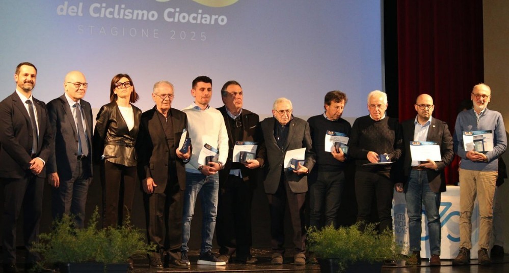 La serata è stata impreziosita da altri due momenti di altissimo valore: la consegna del Premio Speciale al Merito Tecnico a Pierluigi Terrinoni (Furia), premiato sul palco da Valerio Agnoli, e il conferimento del prestigioso Premio Ciclismo Ciociaro 2025 al Dott. Gerardo Palmisano, stimato osteopata del team professionistico Tudor.