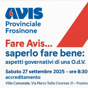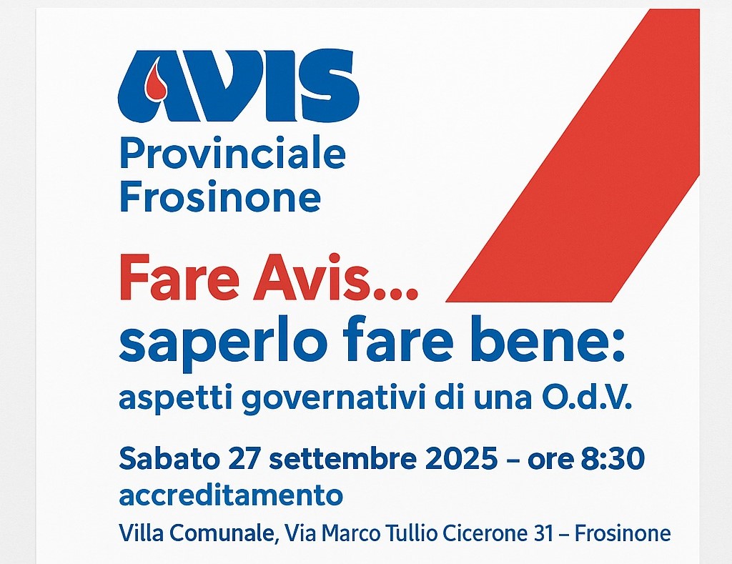 Presso la Villa Comunale di Frosinone, sabato 27 settembre 2025, si svolgerà un evento formativo dedicato ai dirigenti delle Avis delle province di Frosinone e Latina, organizzato nell’ambito del progetto “Fare Avis… saperlo fare bene: aspetti governativi di una O.d.V.”. Un appuntamento fondamentale per approfondire le competenze normative e gestionali che rendono possibile la missione preziosa che queste associazioni portano avanti giorno dopo giorno.