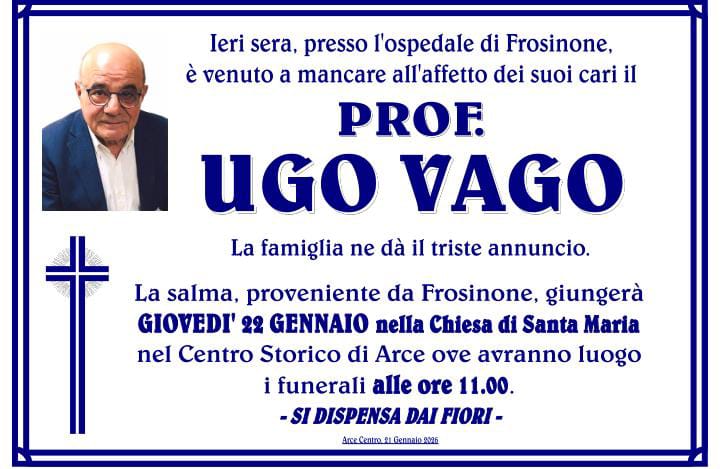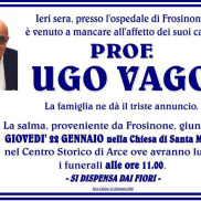 Commozione ad Arce per la morte del professor Ugo Vago. Molto noto e stimato per essere stato valido amministratore comunale e perito assicurativo. I funerali saranno officiati, domani, giovedì 22 gennaio, alle ore 11, presso la chiesa di Santa Maria. Ai familiari le condoglianze dalla redazione del nostro sito.