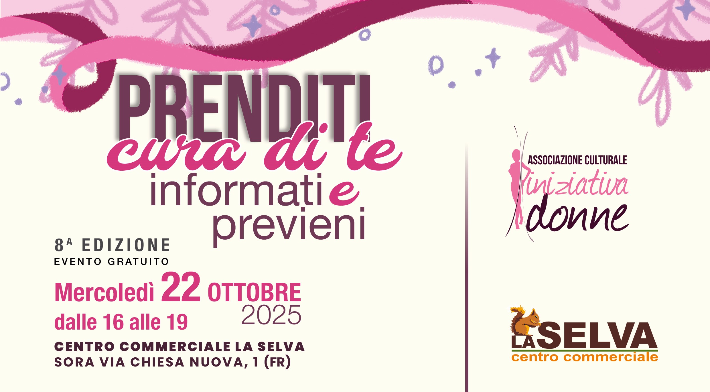 Si terrà presso il Centro Commerciale “La Selva” di Sora l’ottava edizione del format ideato dall’Associazione Culturale no profit “Iniziativa Donne” di Sora “Prenditi cura di te. Informati e Previeni” mercoledì 22 ottobre 2025.